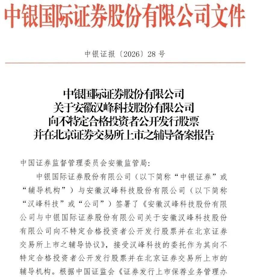 1月23日,安徽汉峰科技股份有限公司在安徽证监局完成IPO辅导备案登记,辅导机构为中银证券。