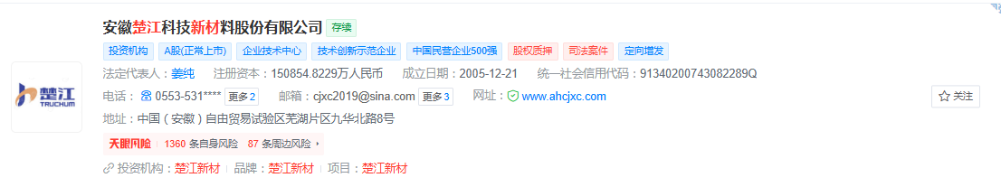 天眼查信息显示,安徽楚江科技新材料股份有限公司 (曾用名:安徽精诚铜业股份有限公司) ,成立于2005年,位于安徽省芜湖市,是一家以从事有色金属冶炼和压延加工业为主的企业,已于2020年完成了定向增发。风险方面发现企业有裁判文书3条;开庭公告5条。