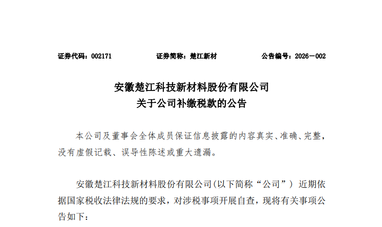 1月24日,芜湖上市公司楚江新材发布公告称,经自查,公司(含子公司)应补缴税款及滞纳金合计4551.01万元,其中补缴税款4069.85万元,滞纳金481.16万元,目前已全部缴纳。