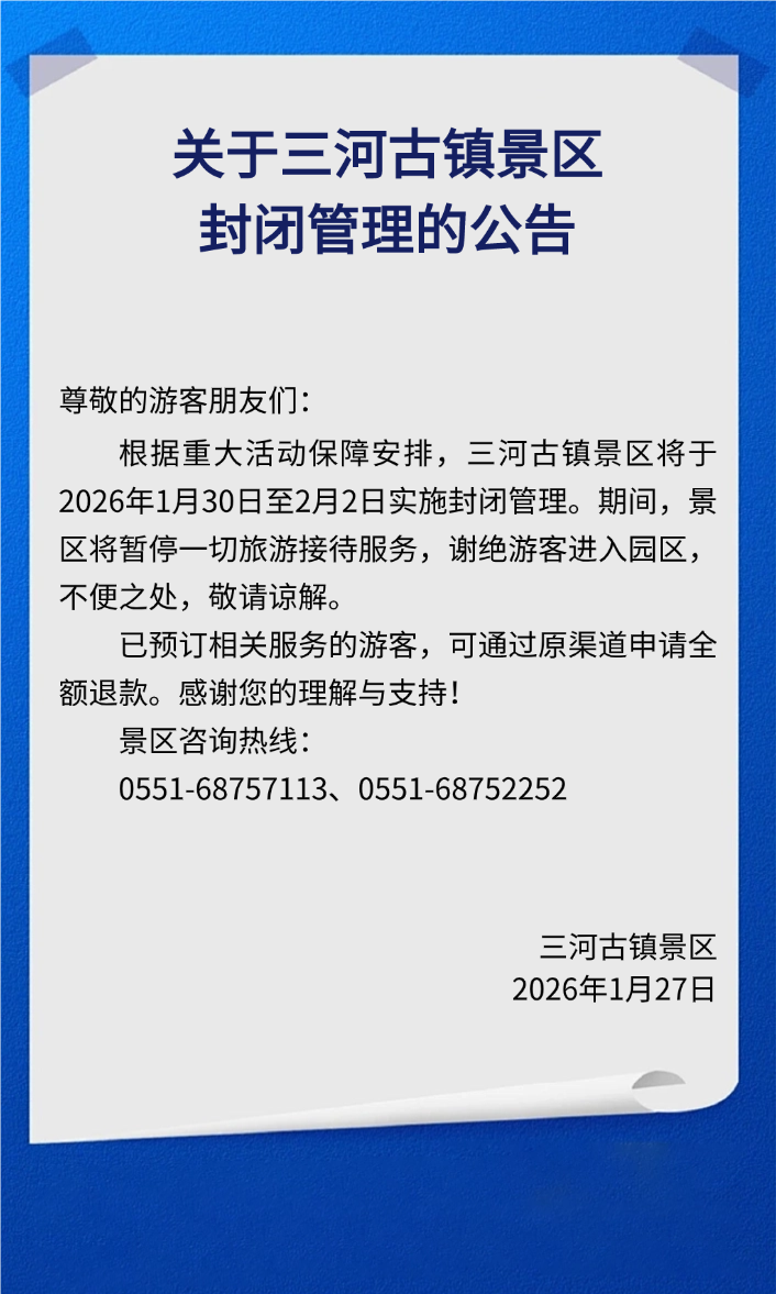 1月27日,安徽三河古镇景区发布公告,将“闭关”4天。公告指出,因重大活动保障需要,三河古镇景区将于今年1月30日-2月2日实施封闭管理。