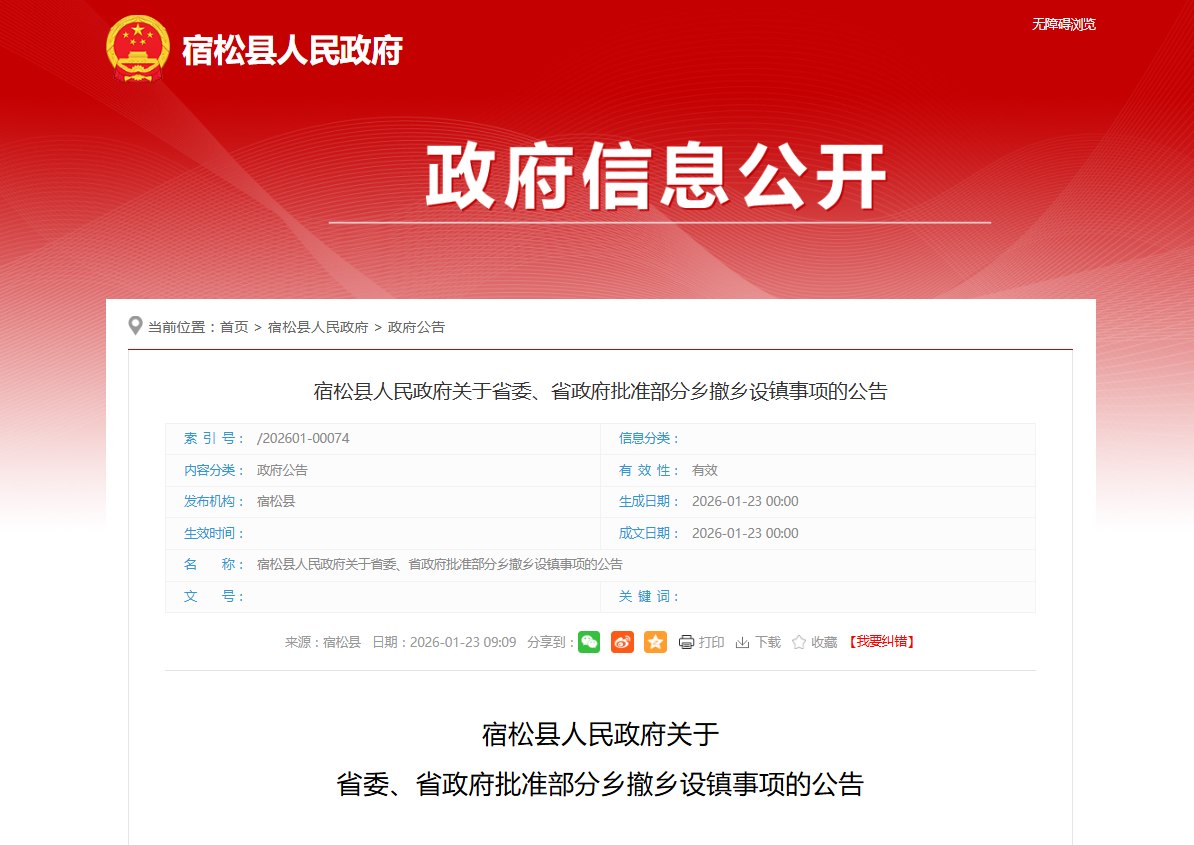 日前,安徽省安庆市宿松县人民政府发布公告。