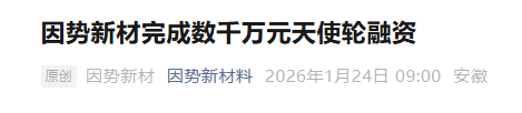 近日,合肥因势新材料科技有限公司(简称“因势新材”)顺利完成数千万元天使轮融资。本轮融资由奇瑞集团的风险投资(CVC)平台瑞丞基金领投,淡马锡旗下的风险投资机构祥峰投资、安徽省国有资本运营控股集团旗下国控投资公司跟投,小米战投继续追加投资。融资资金将主要用于产能扩建与技术研发。