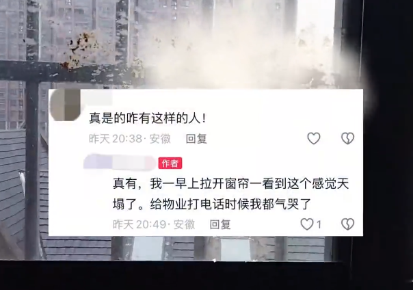 近日,安徽蚌埠某小区有人从高层扔粪便散落6楼业主窗户上,业主怒斥恶心死了。物业工作人员表示,业主已经报警,警方也上门一户一户协查了,没有从楼下面往楼上的监控,日常都有提示禁止高空抛物。