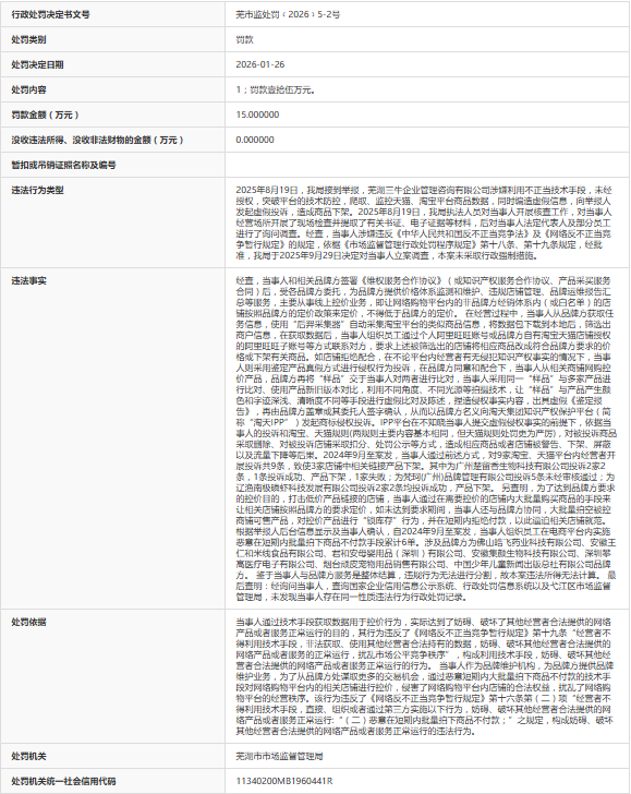 近日,据“信用安徽”公开披露行政处罚信息,因通过技术手段获取数据用于控价行为,实际达到了妨碍、破坏了其他经营者合法提供的网络产品或者服务正常运行的目的,芜湖三牛企业管理咨询有限公司被罚15万元。行政处罚决定书文号是芜市监处罚﹝2026﹞5-2号。