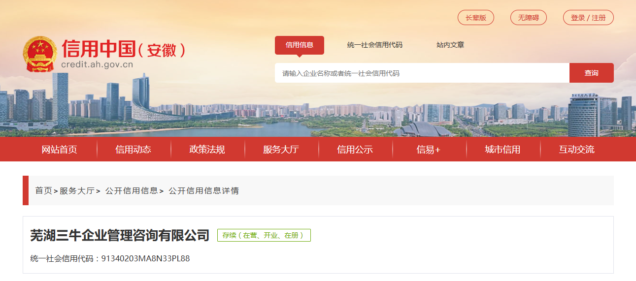 天眼查信息显示,芜湖三牛企业管理咨询有限公司,成立于2021年,位于安徽省芜湖市,是一家以从事商务服务业为主的企业,经营范围包含网络与信息安全软件开发、软件外包服务、市场营销策划、商标代理、平面设计、品牌管理、企业形象策划等。