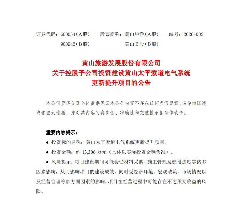 近日,上市公司黄山旅游发展股份有限公司发布“关于控股子公司投资建设黄山太平索道电气系统更新提升项目的公告” 。
