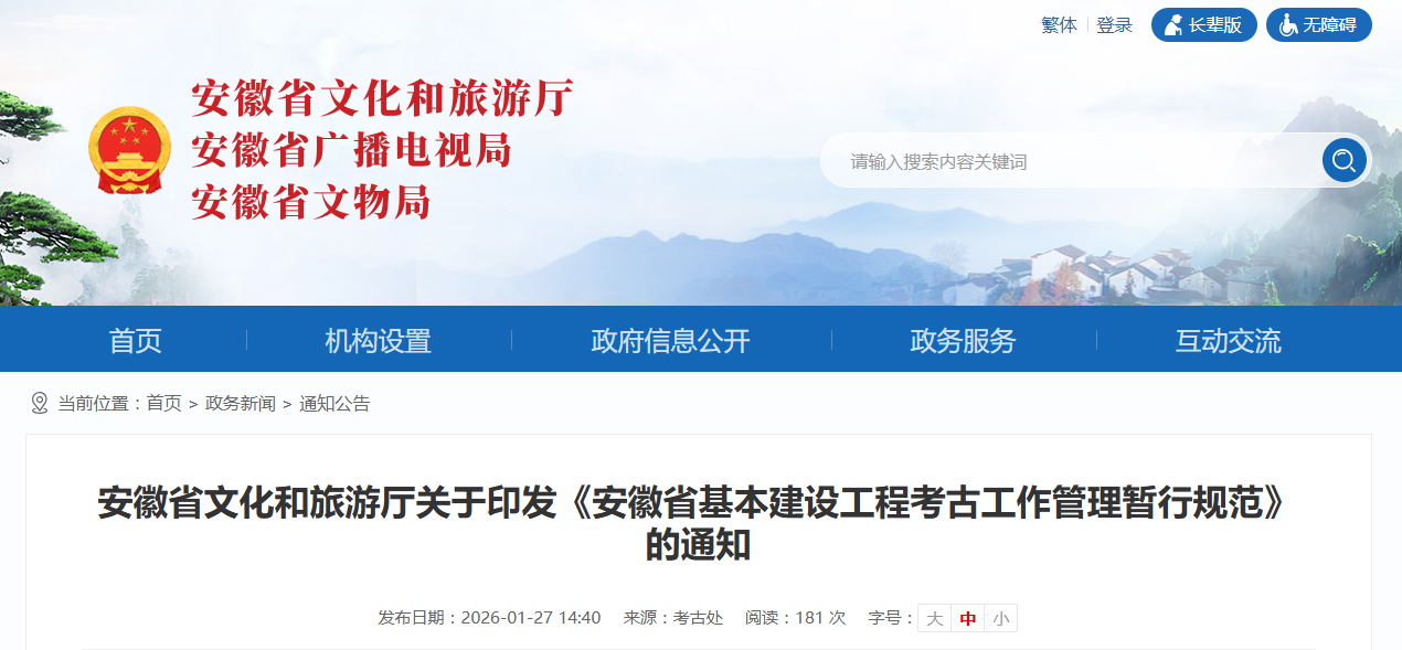 为贯彻落实新修订《中华人民共和国文物保护法》相关要求,进一步提高我省基本建设考古工作效能,我厅编制了《安徽省基本建设工程考古工作管理暂行规范》,现印发给你们,请结合本地实际,认真贯彻执行。
