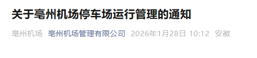 1月28日,亳州机场管理有限公司发布亳州机场停车场运行管理通知,机场停车场仍实行免费停放政策,暂不收取任何停车费用。