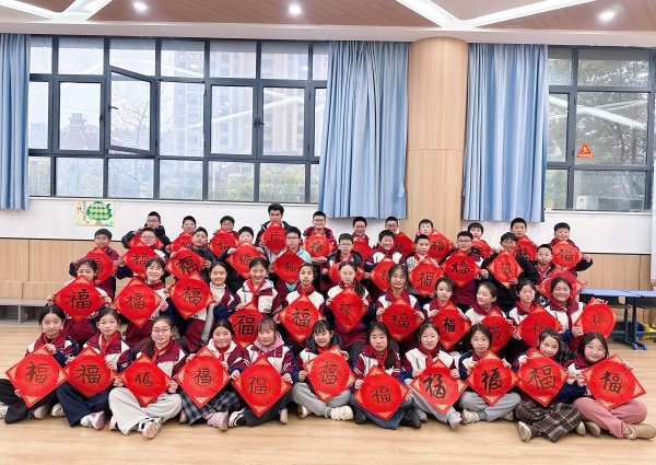 活动现场,红纸铺展,墨香飘散。在曾亚楠老师的悉心指导下,同学们纷纷提起毛笔,蘸墨挥毫。他们神情专注,一笔一划认真书写,横竖撇捺间尽显对传统书法艺术的初探与热情。一幅幅充满童真又寓意吉祥的春联和“福”字在笔下诞生,虽笔触稚嫩,却饱含着对新年的诚挚祝福与美好憧憬。融融暖意与欢声笑语充盈教室,节日的喜庆气氛格外浓厚。