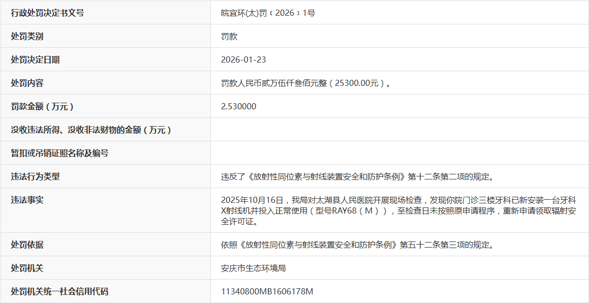 近日,据“信用安徽”公开披露行政处罚信息,因未按程序重领辐射许可证,太湖县人民医院被处以罚款2.53万元。行政处罚决定书文号是皖宜环(太)罚﹝2026﹞1号。
