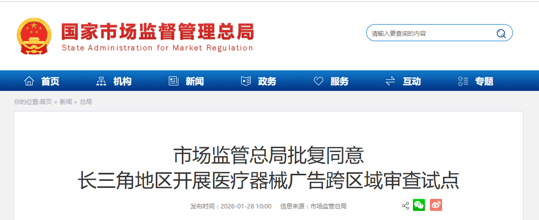 为纵深推进全国统一大市场建设,推动长三角市场监管一体化发展,近日,市场监管总局批复同意上海市、江苏省、浙江省、安徽省市场监管局在长三角地区开展医疗器械广告跨区域审查试点工作。