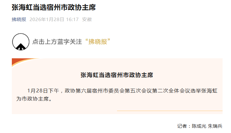 据拂晓报消息,1月28日下午,政协第六届宿州市委员会第五次会议第二次全体会议选举张海虹为市政协主席。