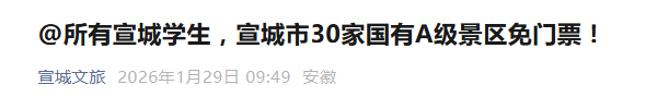 1月29日,据“宣城文旅”消息,宣城市国有A级旅游景区对本市学生免费开放。原文如下: