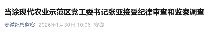 当涂现代农业示范区党工委书记张亚涉嫌严重违纪违法,目前正接受当涂县纪委监委纪律审查和监察调查。(当涂县纪委监委)