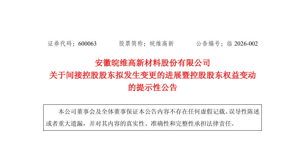1月29日,皖维高新公告称,公司接到控股股东皖维集团通知,海螺集团拟通过现金增资49.98亿元的方式持有皖维集团60%的股权,间接控制皖维高新18.24%的股份;安徽省投资集团、安徽省国控集团拟通过无偿划转方式分别取得皖维集团各20%的股权、皖维高新各7.50%的股份。本次收购完成后,皖维集团仍为皖维高新的控股股东,海螺集团将成为皖维高新间接控股股东,皖维高新实际控制人仍为安徽省国资委。本次收购尚需完成相关审查及过户登记手续。