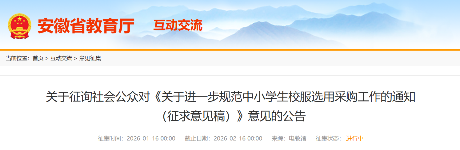 日前,安徽省教育厅发布关于征询社会公众对《关于进一步规范中小学生校服选用采购工作的通知(征求意见稿)》意见的公告。