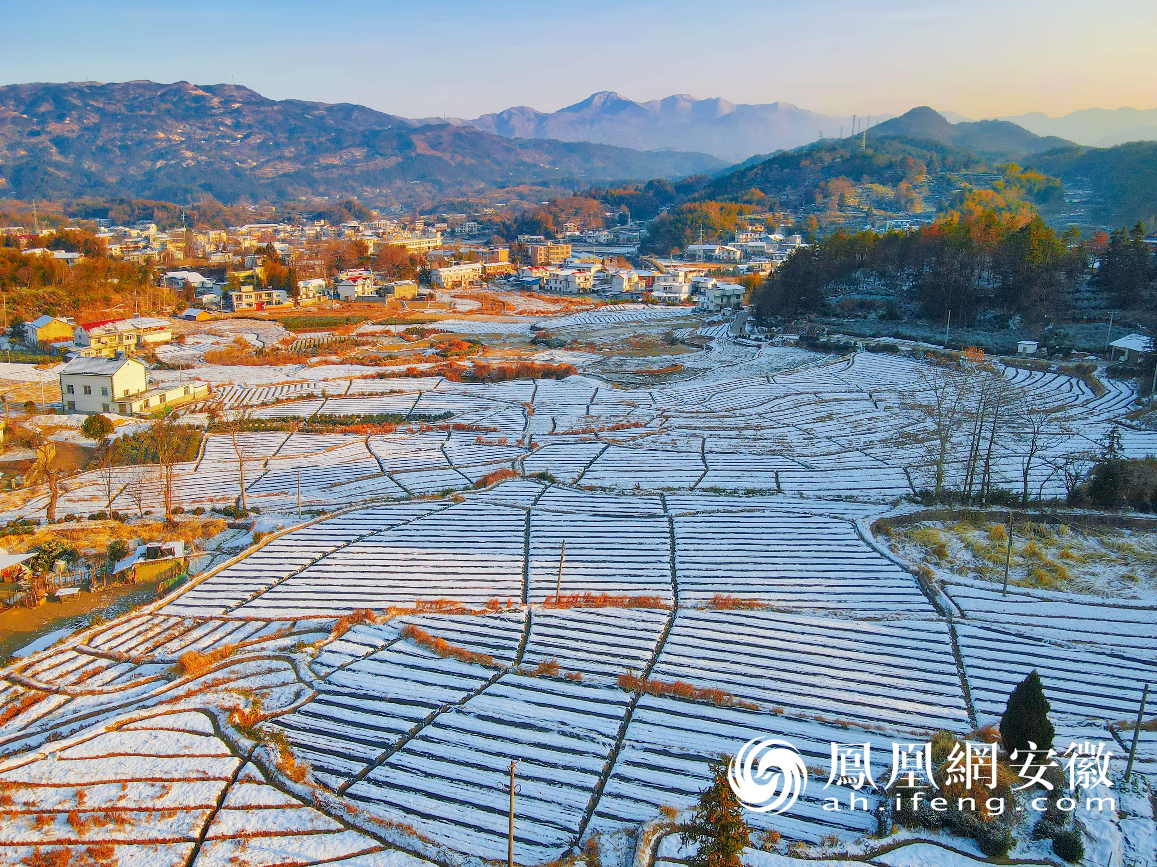 1月21日,雪后的安徽省安庆市岳西县莲云乡珠屋村,层层叠叠的种植基地银装素裹,宛如大地上铺开皑皑诗笺,与错落有致的民居、连绵起伏的山峦等交相辉映,构成一幅大别山腹地和美乡村冬日新画卷。(凤凰网安徽特约摄影师 吴均奇/摄)