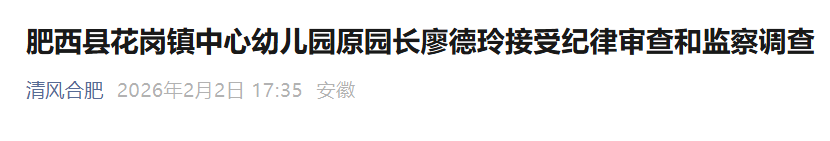 肥西县花岗镇中心幼儿园原园长廖德玲涉嫌严重违纪违法,目前正接受肥西县纪委监委纪律审查和监察调查。(肥西县纪委监委)