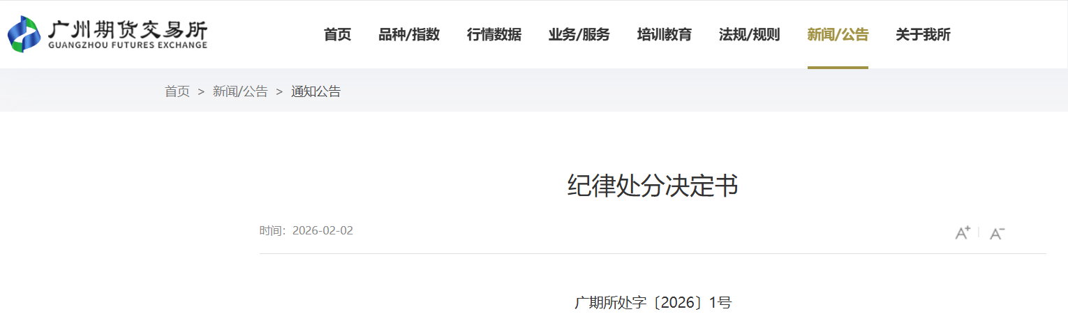 2月2日,广期所发布纪律处分决定书,详情如下: