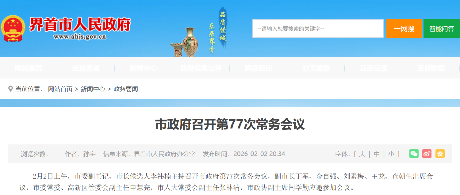 据界首市人民政府网消息:2月2日上午,市委副书记、市长候选人李祎楠主持召开市政府第77次常务会议。