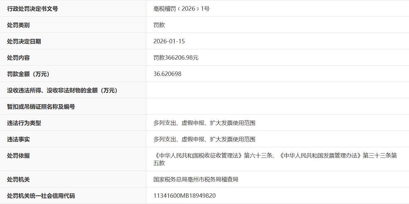 近日,据“信用安徽”公开披露行政处罚信息,因多列支出、虚假申报、扩大发票使用范围,安徽佰顺堂中药饮片有限公司被处以罚款36.620698万元。行政处罚决定书文号是亳税稽罚﹝2026﹞1号。