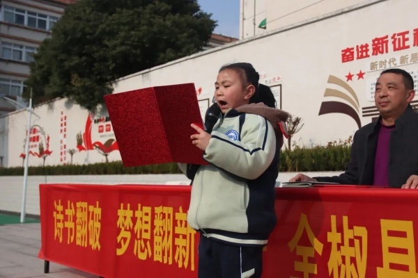 一年级学生代表上台发言,用稚嫩却坚定的声音表达对古诗学习的热爱与期待,承诺将“认真诵读,坚持积累”,让诗词陪伴整个寒假。