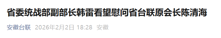 据“安徽台联”消息,2月2日上午,省委统战部副部长韩雷、省台联副会长管群、省委统战部港澳台工作处主要负责同志一行看望慰问省台联原会长陈清海。