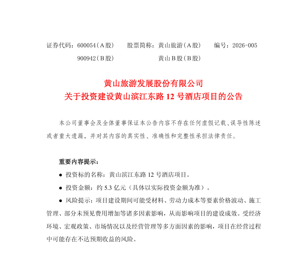 2、随着黄山市大交通格局的不断完善,为顺应黄山市旅游发展趋势,丰富目的地旅游产品供给,公司于2026年2月3日召开第九届董事会第十九次会议,审议通过了《关于投资建设黄山滨江东路12号酒店项目的议案》,同意公司投资建设黄山滨江东路12号酒店项目,预计投资金额约为5.3亿元(具体以实际投资金额为准),资金来源为公司自筹资金。