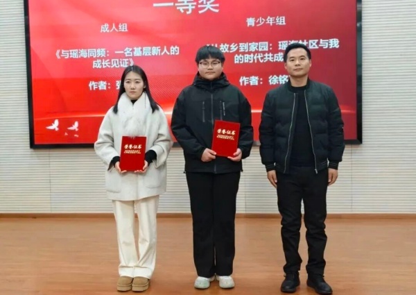 演讲比赛落幕后,进入征文颁奖环节。现场为征文评选中表现优异的成人组和青少年组选手颁发荣誉证书。天水路小学周逸凡同学和王梓依同学分别荣获青少年组的二、三等奖。