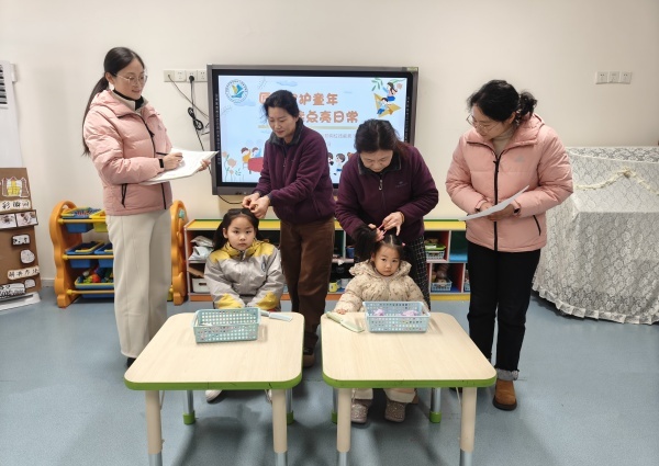 展示现场,充满了温馨与灵动。保育员们化身“巧手妈妈”,在“模特”头上或编、或扎、或盘,灵巧的双手上下翻飞,一个个精致可爱的发型便完成了,既美观又稳固,充分考虑了幼儿活动时的舒适与安全,展现了保育员们对孩子们生活起居无微不至的关爱。
