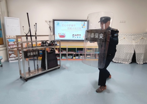 保安人员首先进行了防卫器械规范化操作展示,包括防暴盾牌、钢叉、警棍等器械的配合使用。他们动作刚劲有力,战术走位清晰,展现了应对突发暴力事件的快速反应与处置能力。紧接着的现场应急突发事故模拟处置演练,模拟了“可疑人员强行闯入”场景。从发现异常、启动应急预案、器械阻挡、人员疏散,整个过程紧张有序,步骤清晰,分工明确,充分体现了安保人员训练有素的职业素养和守护校园第一道防线的决心与能力。