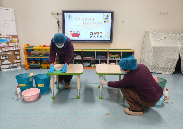 按照“清—消—清”的规范流程,保育员们配置消毒液、分区擦拭、停留消毒、清水去残,动作流畅,顺序清晰,边角到位。口中同步讲解要点,将日常工作中对卫生安全的高度负责和标准化操作现场呈现。