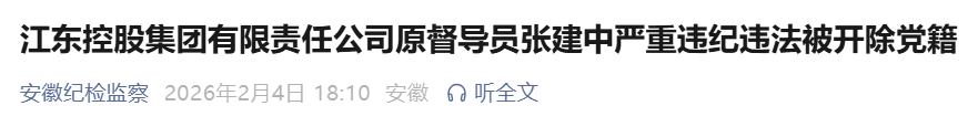 日前,经中共马鞍山市委批准,马鞍山市纪委监委对江东控股集团有限责任公司原督导员张建中严重违纪违法问题进行了立案审查调查。