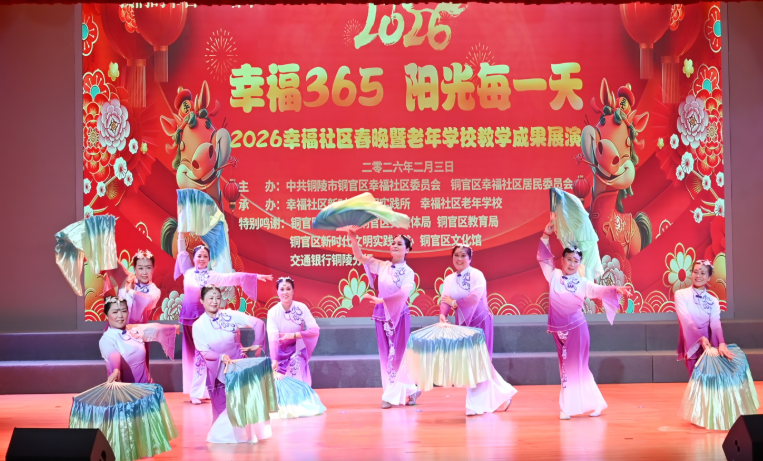 鼓乐迎春添喜气,艺韵社区聚民心。2月3日下午,铜陵市铜官区幸福社区主办的“幸福365,阳光每一天”——2026幸福社区春晚暨老年学校教学成果展演,在铜官区文化馆圆满举行,为辖区居民送上一场浸润人心的文化盛宴。
