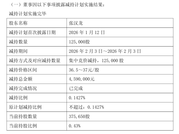 公司于2026年2月4日收到张汉龙先生出具的《减持股份结果告知函》,张汉龙先生于2026年2月3日,通过集中竞价方式累计减持公司股份125,000股,占公司总股本的0.1427%。本次减持完成后,张汉龙先生持有公司股份375,650 股,占公司总股本的0.43%。