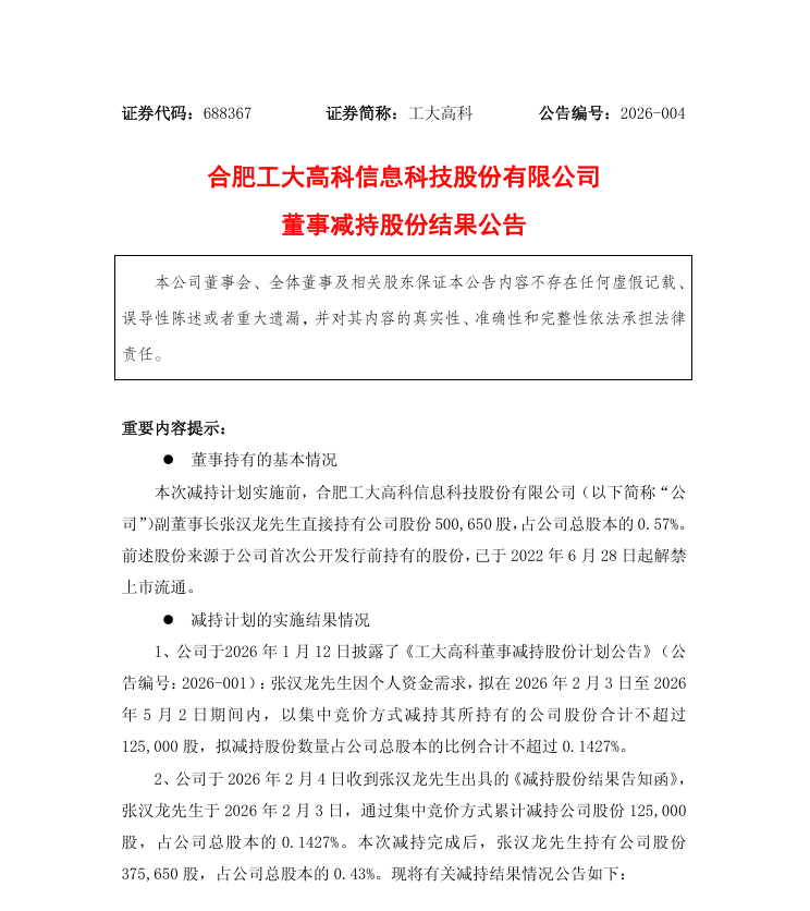 公告称,公司于2026年1月12日披露了《工大高科董事减持股份计划公告》(公告编号:2026-001):张汉龙先生因个人资金需求,拟在2026年2月3日至2026年5月2日期间内,以集中竞价方式减持其所持有的公司股份合计不超过125,000 股,拟减持股份数量占公司总股本的比例合计不超过0.1427%。