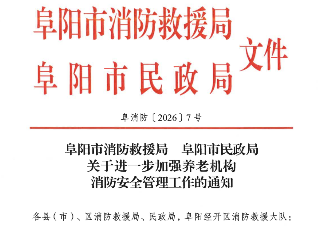 2月4日,阜阳市消防救援局、阜阳市民政局联合发布关于进一步加强养老机构消防安全管理工作的通知,就养老机构消防安全管理工作作出全面部署并明确五大重点工作要求。2月4日晚,市消防救援局联合多部门在全市开展养老机构消防安全夜查,重点检查消防设施、用火用电用气、生命通道、值班值守及应急处置等环节。详情如下: