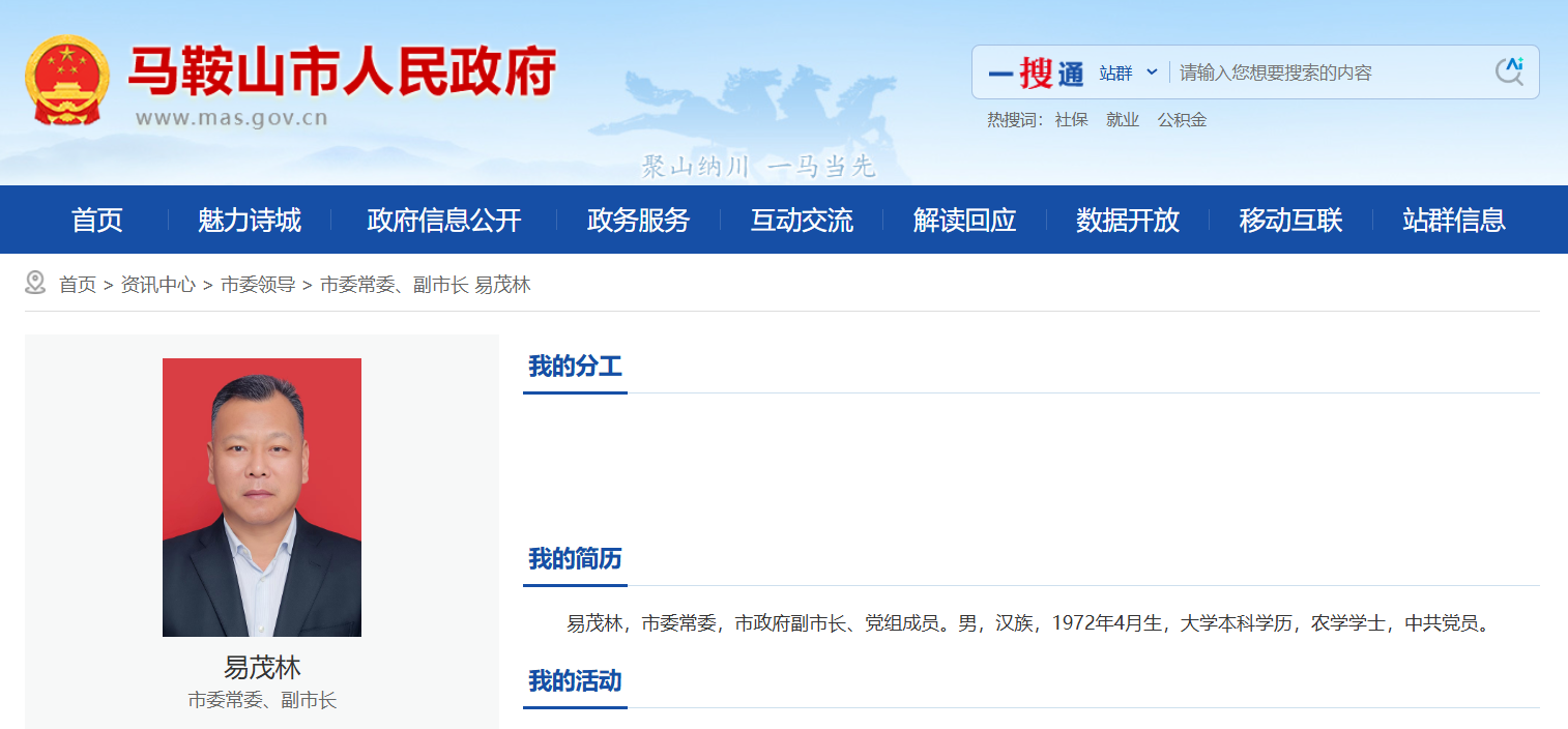 2025年12月24日,安徽省委组织部发布干部任前公示,其中:易茂林,男,汉族,1972年4月生,大学学历,农学学士,中共党员,现任马鞍山市副市长,拟任省辖市市委常委。