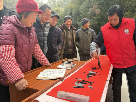 本次活动旨在深入推进乡村文化振兴,丰富村民精神文化生活,用接地气、暖人心的活动凝聚乡村温情。随着欢快的音乐响起,村广场舞队带来的节目活力登场,队员们兴致高昂,舞步整齐划一,将现场气氛瞬间点燃。紧随其后的“幸运大转盘”环节,题目涵盖安全生产、惠民政策等内容,村民们踊跃举手抢答,现场掌声与欢笑声此起彼伏。村民们还自发登台展示才艺,展现出新时代农民的精神风貌。活动还邀请当地书法爱好者现场挥毫泼墨,为村民书写春联与福字。红红的春联、浓浓的墨香,不仅增添了新春的喜庆氛围,更将文化惠民的温暖送到了村民心坎上。