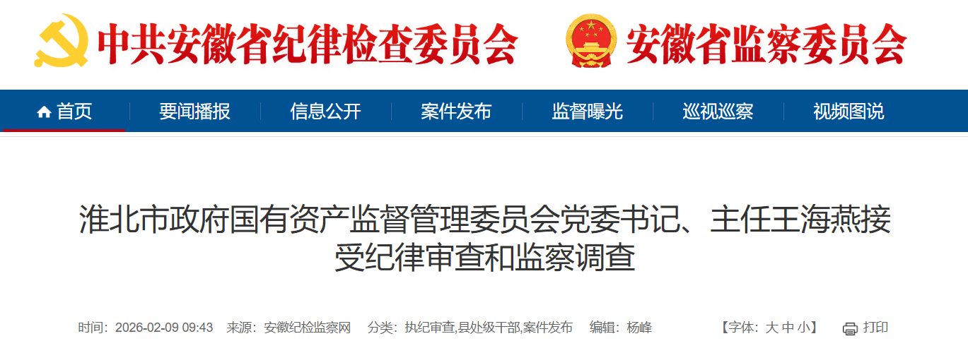 淮北市政府国有资产监督管理委员会党委书记、主任王海燕涉嫌严重违纪违法,经安徽省纪委监委指定管辖,目前正接受六安市纪委监委纪律审查和监察调查。(六安市纪委监委)