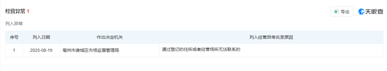 天眼查信息显示,安徽梅见酒业有限公司,成立于2023年,位于安徽省亳州市,是一家以从事酒、饮料和精制茶制造业为主的企业,经营范围包含食品生产、食品销售、酒类经营等。2025年8月,因通过登记的住所或者经营场所无法联系,该公司被亳州市谯城区市场监督管理局列入经营异常名录。