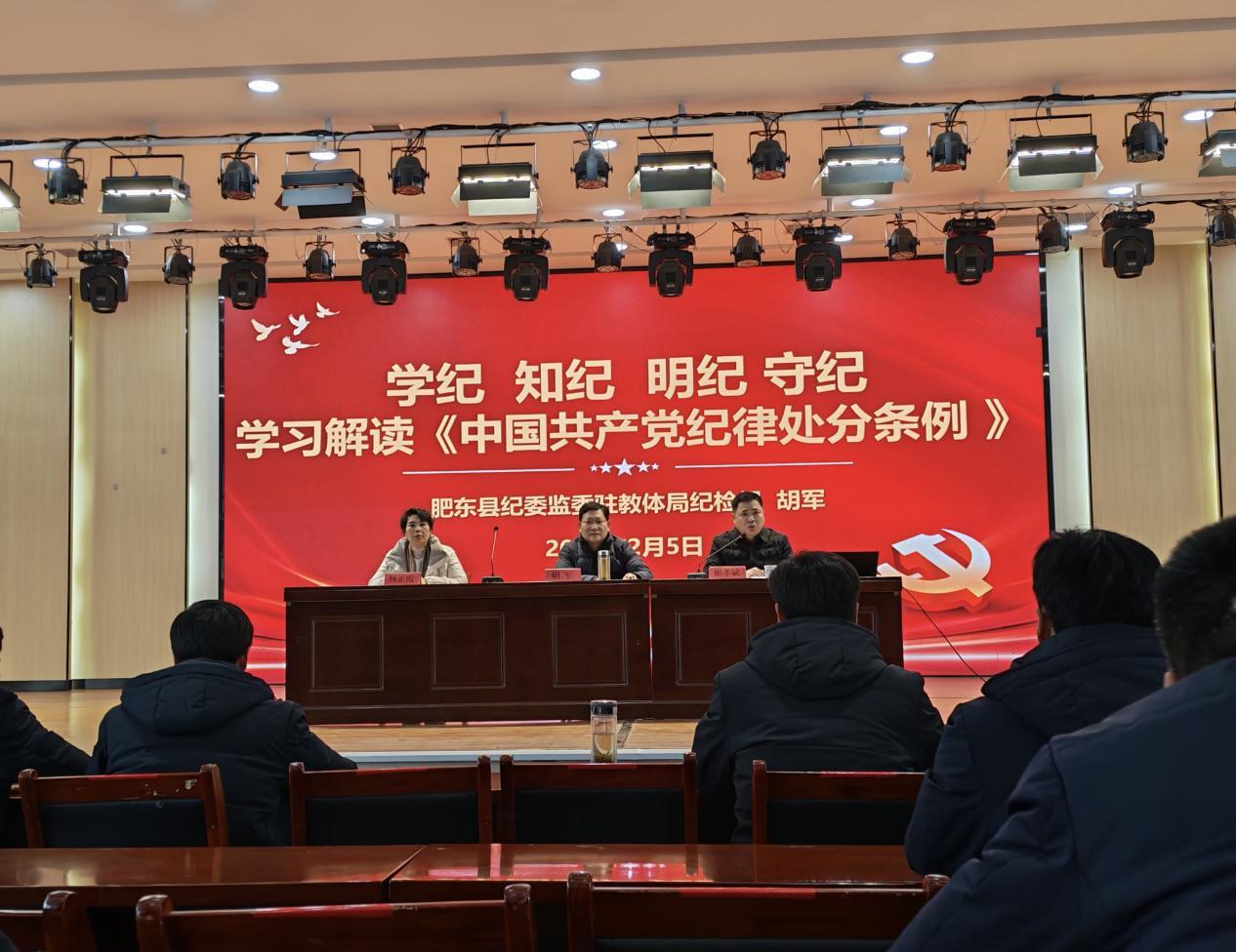 会议伊始,特邀肥东县纪委监委驻教体局纪检组三级主任科员胡军作《学纪 知纪 明纪 守纪——学习解读〈中国共产党纪律处分条例〉》专题讲座。讲座深入分析当前党风廉政建设和反腐败斗争的复杂严峻形势,深刻阐释《条例》修订的意义,结合典型案例、以案明纪、以案释法,引导全体教职工准确把握各项纪律要求,坚守师德底线、涵养清廉师风,切实筑牢廉洁从教、依法执教、立德树人的思想根基。