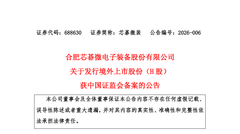 2月7日,合肥芯碁微电子装备股份有限公司(688630.SH)发布公告称,公司发行境外上市股份(H股)并在香港联合交易所主板上市的相关工作已获得中国证监会备案。