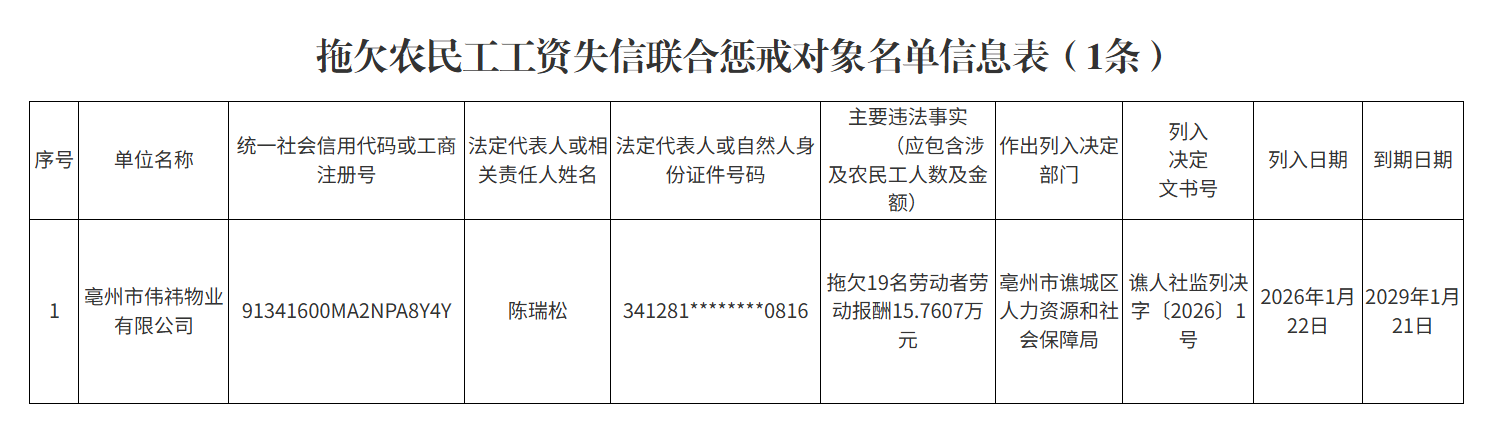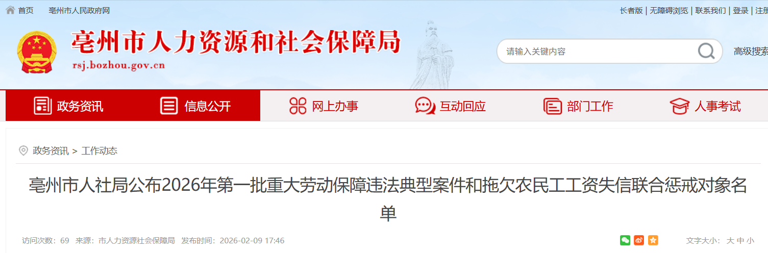 2月9日,亳州市人社局公布2026年第一批8起重大劳动保障违法典型案件和1条拖欠农民工工资失信联合惩戒对象名单,详情如下: