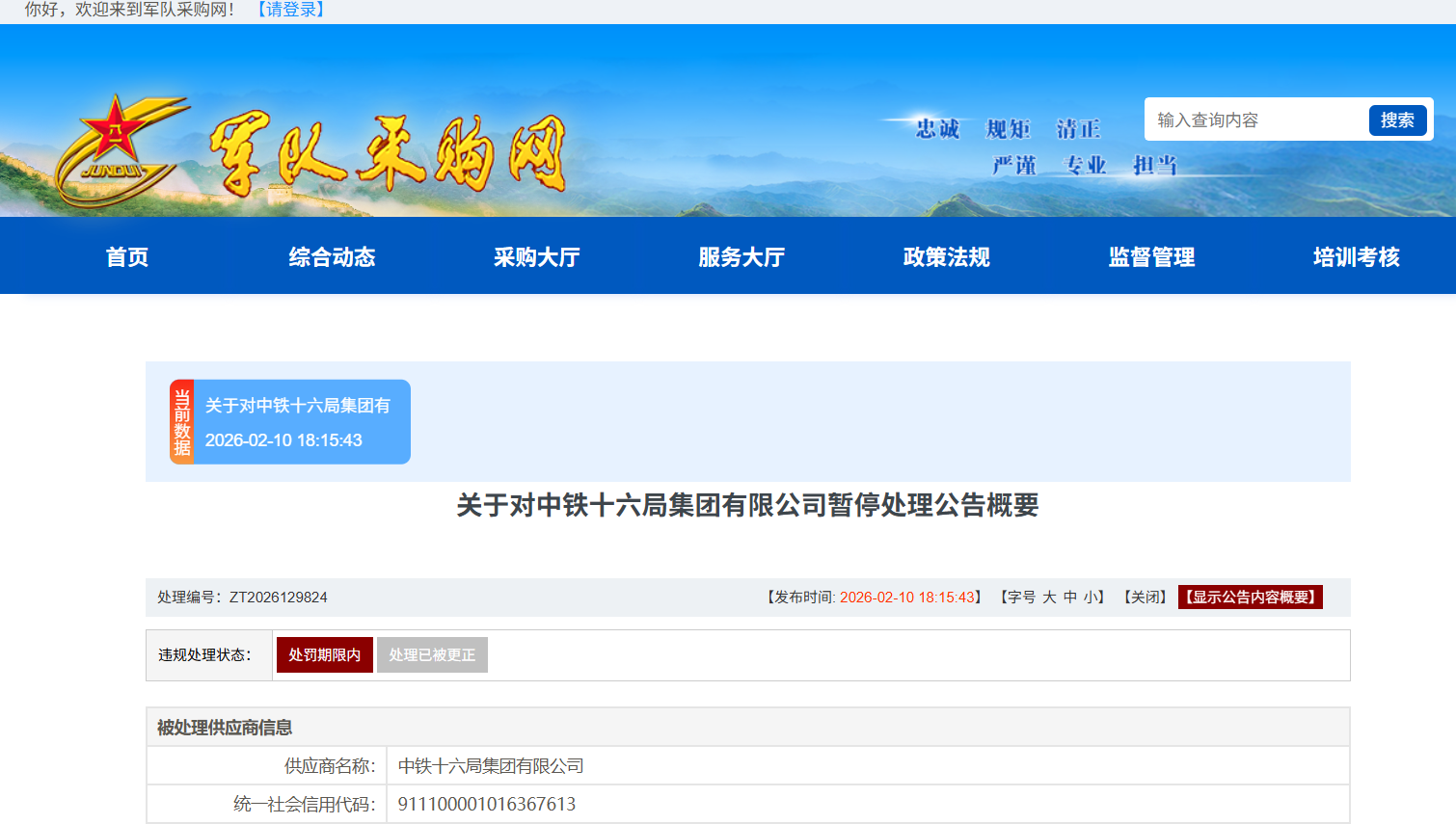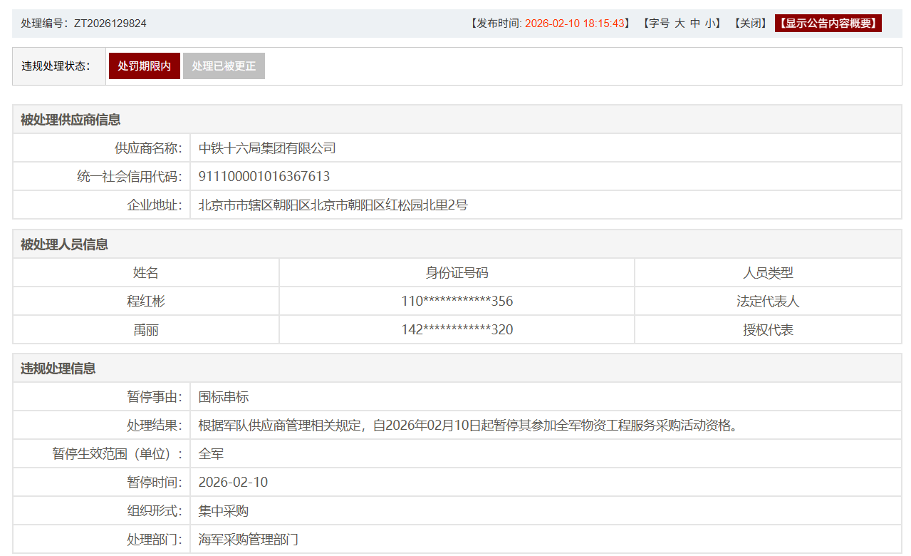 公告信息显示,《关于对中铁十六局集团有限公司暂停处理公告》(处理编号:ZT2026129824)显示,中铁十六局集团有限公司围标串标,根据军队供应商管理相关规定,自2026年02月10日起暂停其参加全军物资工程服务采购活动资格。