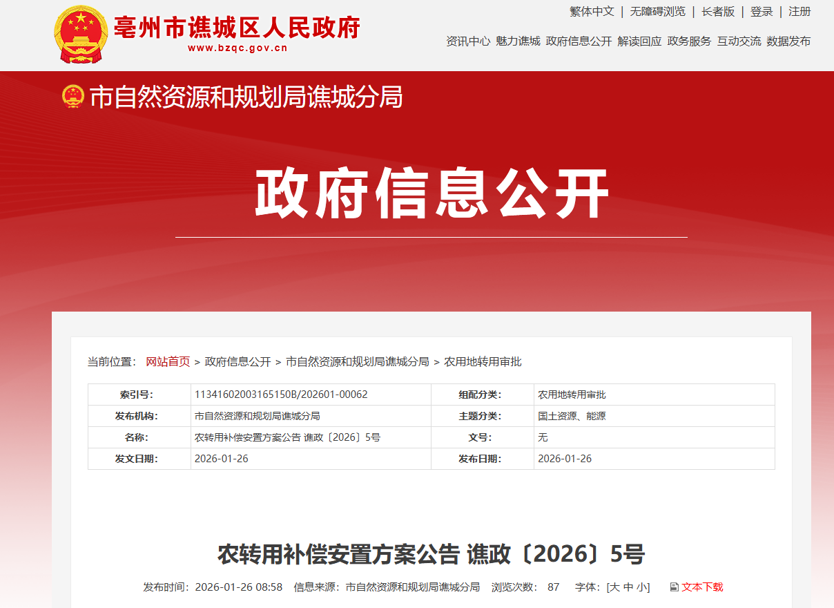 根据《中华人民共和国土地管理法》第四十四条、第四十七条、第四十八条,《中华人民共和国土地管理法实施条例》第二十三条、第二十八条以及《安徽省土地征收及补偿安置办法》第十一条、第十二条等规定,依据《亳州市谯城区人民政府农用地转用公告》(谯政〔2026〕3号)开展的土地现状调查结果,拟转用华佗镇五里社区李老庄组集体土地0.3213公顷、祝集村方庄组集体土地0.122公顷,魏岗镇马场村西格组集体土地0.2308公顷,十八里镇马营村吴庄组集体土地0.014公顷、十八里社区何营庄组集体土地0.0197公顷。亳州市谯城区人民政府组织自然资源、财政、农业农村、人力资源和社会保障等部门拟定了补偿安置方案,现将补偿安置方案有关事项公告如下。