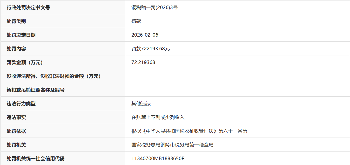 近日,据“信用安徽”公开披露行政处罚信息,因在账簿上不列或少列收入,枞阳县官埠桥镇继光村石子厂(普通合伙)被处以罚款72.219368万元。行政处罚决定书文号是铜税稽一罚(2026)3号。