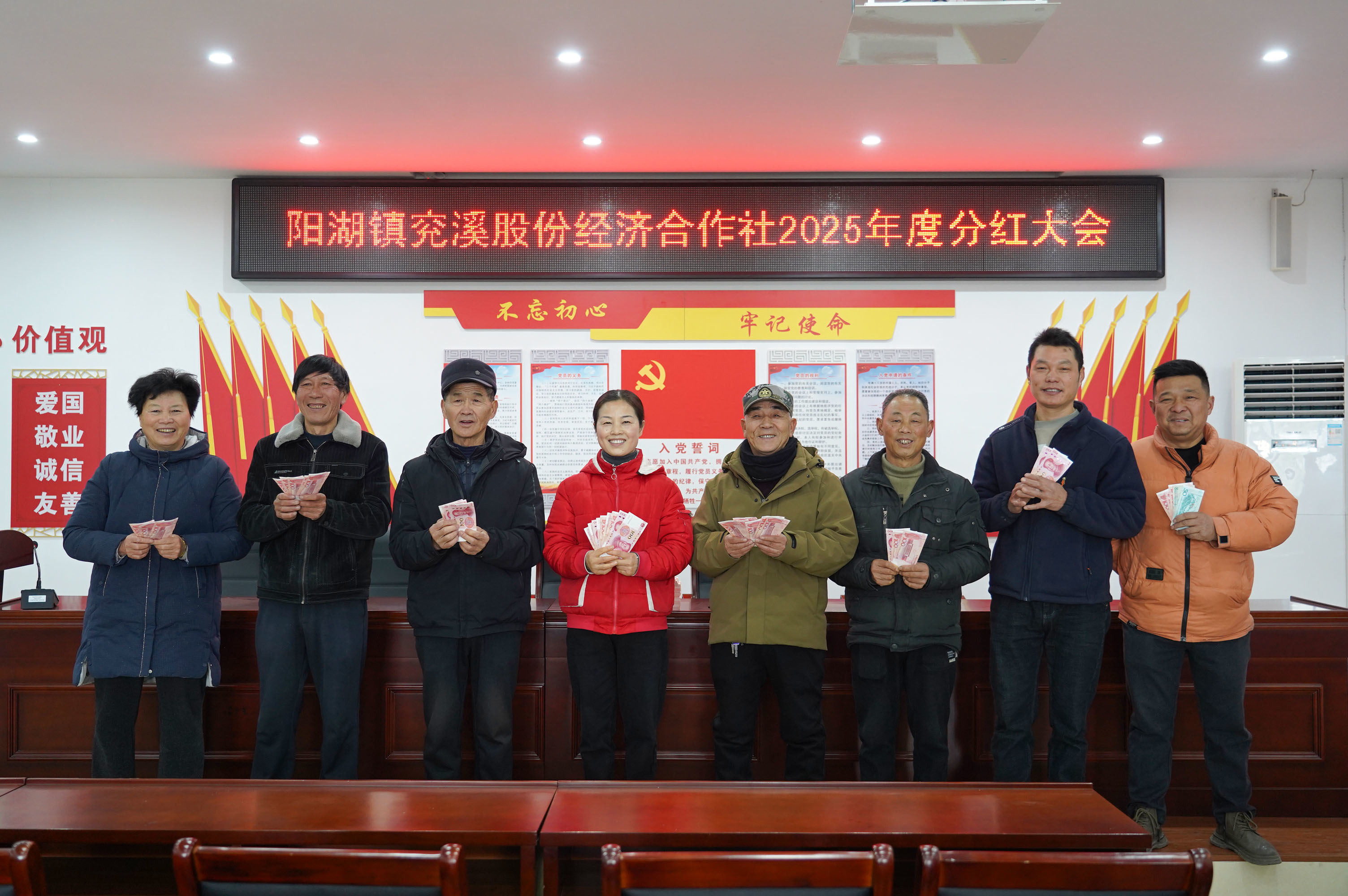接下来,最让人期待的分红环节开始了。在大家的注视下,工作人员按照每位股民的持股数和合作社的分红方案,认真核对、准确计算,确保分得清楚、发得明白。村“两委”和股份经济合作社在广泛征求村民意见后,确定每股分红26元,全村1889名股民都能受益,一共发放36.95万元。“资金比较多,今天仪式上少量发些现金,其他分红已经直接打到大家的银行账户上。”汪志平语气肯定。