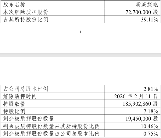 近日,新集能源发布公告,公司持股5%以上股东安徽新集煤电(集团)有限公司于2026年2月11日将其质押在国元证券股份有限公司的无限售流通股7270.00万股提前解除质押,并已完成股份解除质押登记手续。详情如下: