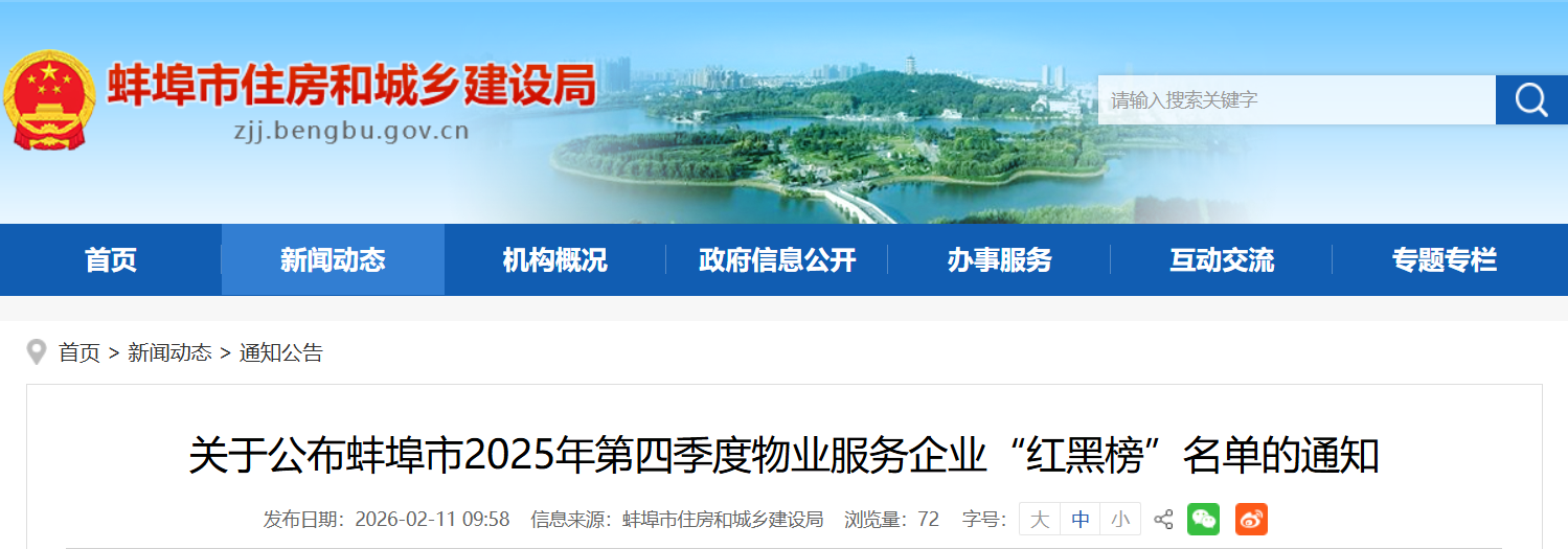 近日,蚌埠市住建局公布蚌埠市2025年第四季度物业服务企业“红黑榜”名单的通知,详情如下:
